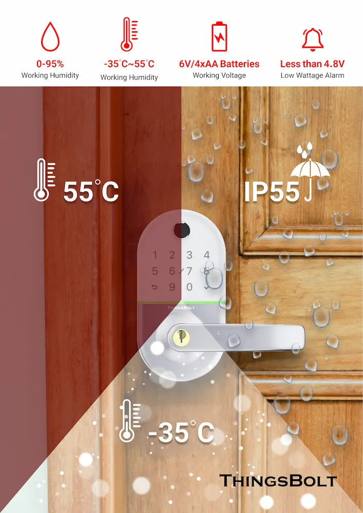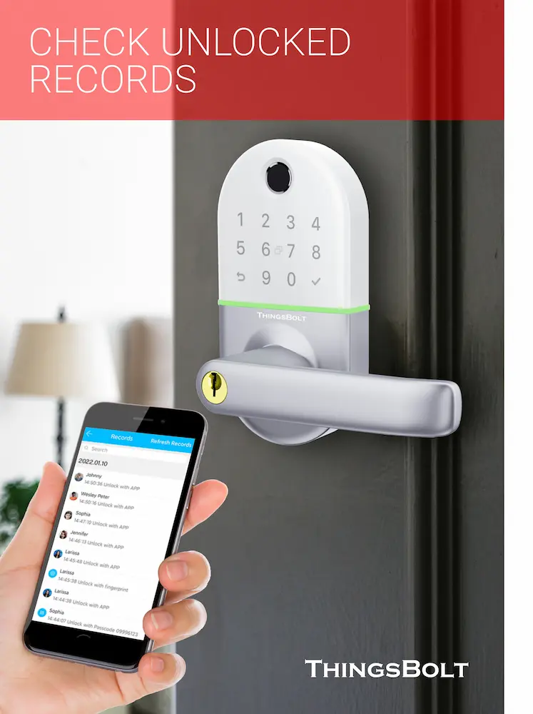 • Manage Access with APP: Authorize unlock permissions for your family or friends with the ThingsBolt APP. Generate one-time passcords for your temporary visitors when you out. Check the unlock record in the APP to know who and when unlocked your door. You can manage more than 1000 locks with just one APP.